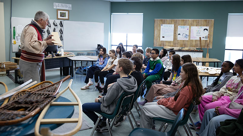 Beyond the woodshop, students participated in a presentation where Mark shared “forgotten knowledge” from Indigenous cultures. He brought history to life with artifacts like woven baskets and mini canoes, while leading a vital conversation on the impact of the Residential School System. He explained how generational skills in agriculture, transportation, and medicine were interrupted by this history, and shared his passion for ensuring these skills are celebrated and taught to the next generation.