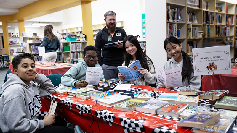 Students Visit the Pit Stop Café During I Love to Read MonthStudents were invited to quickly sample a buffet of books at the Pit Stop Café during our first week of “Ready, Set, Read” events. The library was transformed into a restaurant where students were introduced to a variety of authors and genres (Sport Fiction, Historical Fiction, Mystery, Adventure, Fantasy Fiction and Realistic Fiction), allowing them to sample, choose “appetizers and entrées”, and order “take out” when they found books to their liking!